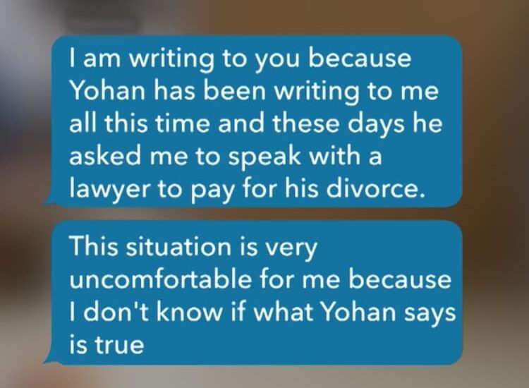Daniele’s messages from this lady mentioned Yohan asking her to speak to a lawyer and pay for his divorce. The lady adds that the “situation is very uncomfortable” for her because she doesn’t know if what he is telling her is true.