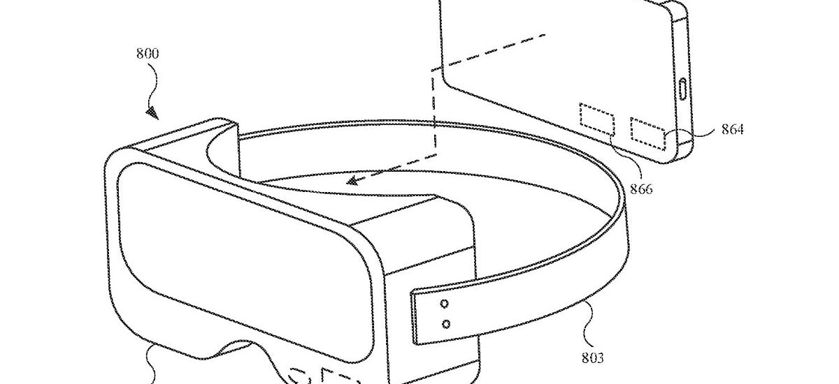 The patent also includes an illustration that shows an isometric view of a headset-like accessory (denoted by the figure 11-800) that can wirelessly detect an electronic device like an iPhone (denoted by the figure 11-850). The head-mounted device could take the form of a virtual reality or augmented reality headset, according to the document, which describes a receptacle for the headset and a band that wraps around a user’s head. The headset and the phone are shown to communicate using wireless circuitry on both devices.