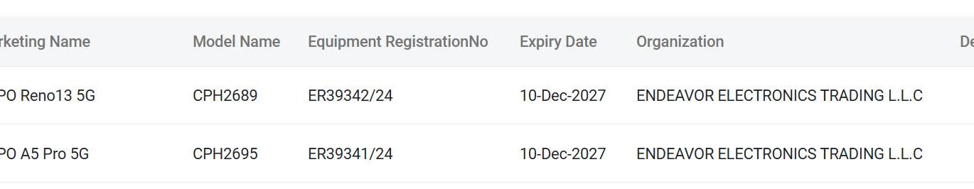 The Oppo Reno 13 5G and Oppo A5 Pro 5G are listed on the TDRA website with model numbers CPH2689 and CPH2695, respectively. The listing, dated December 10, suggests that the phones are on their way to global markets, as expected. The listing doesn’t include any details besides their monikers and model numbers.
