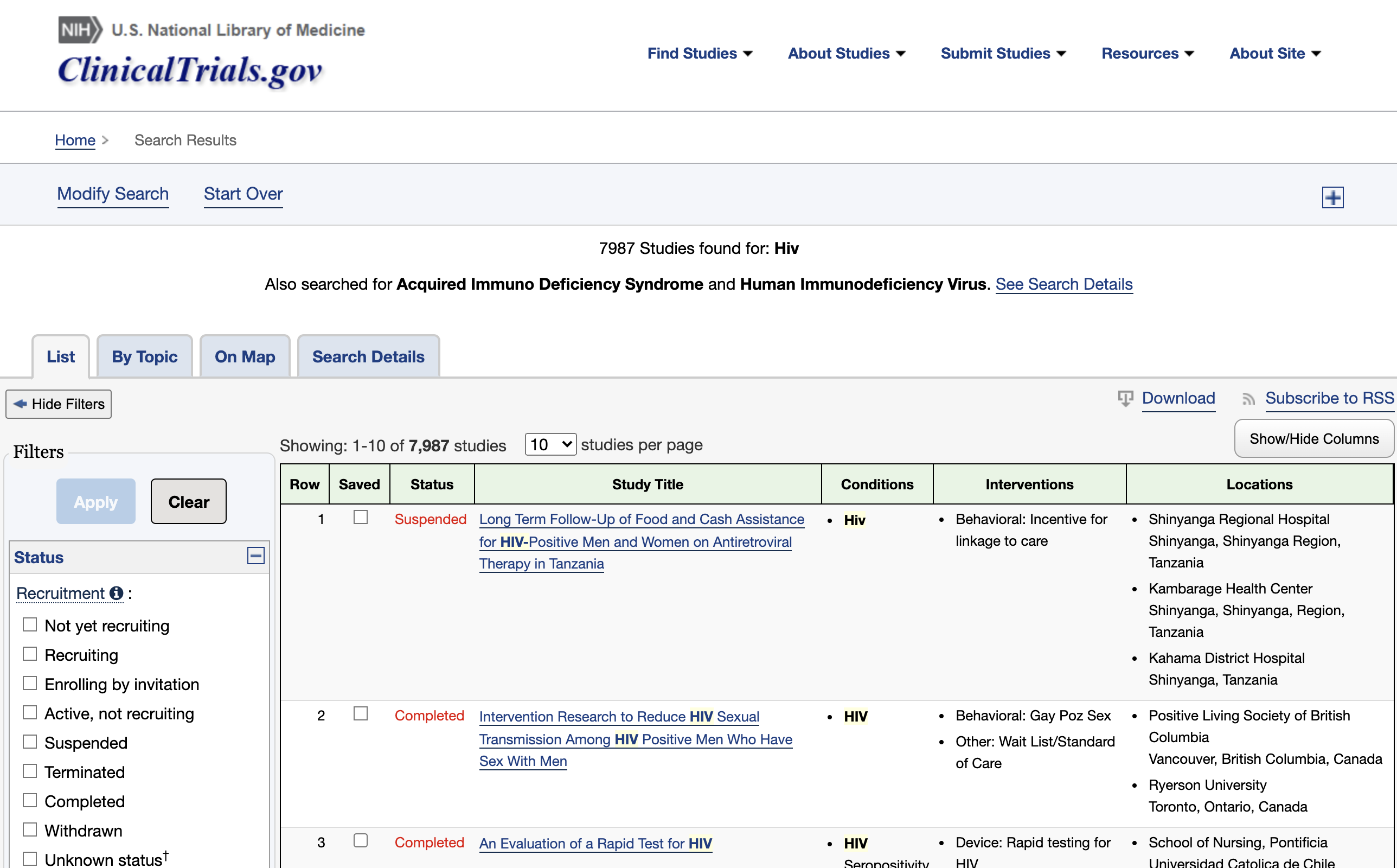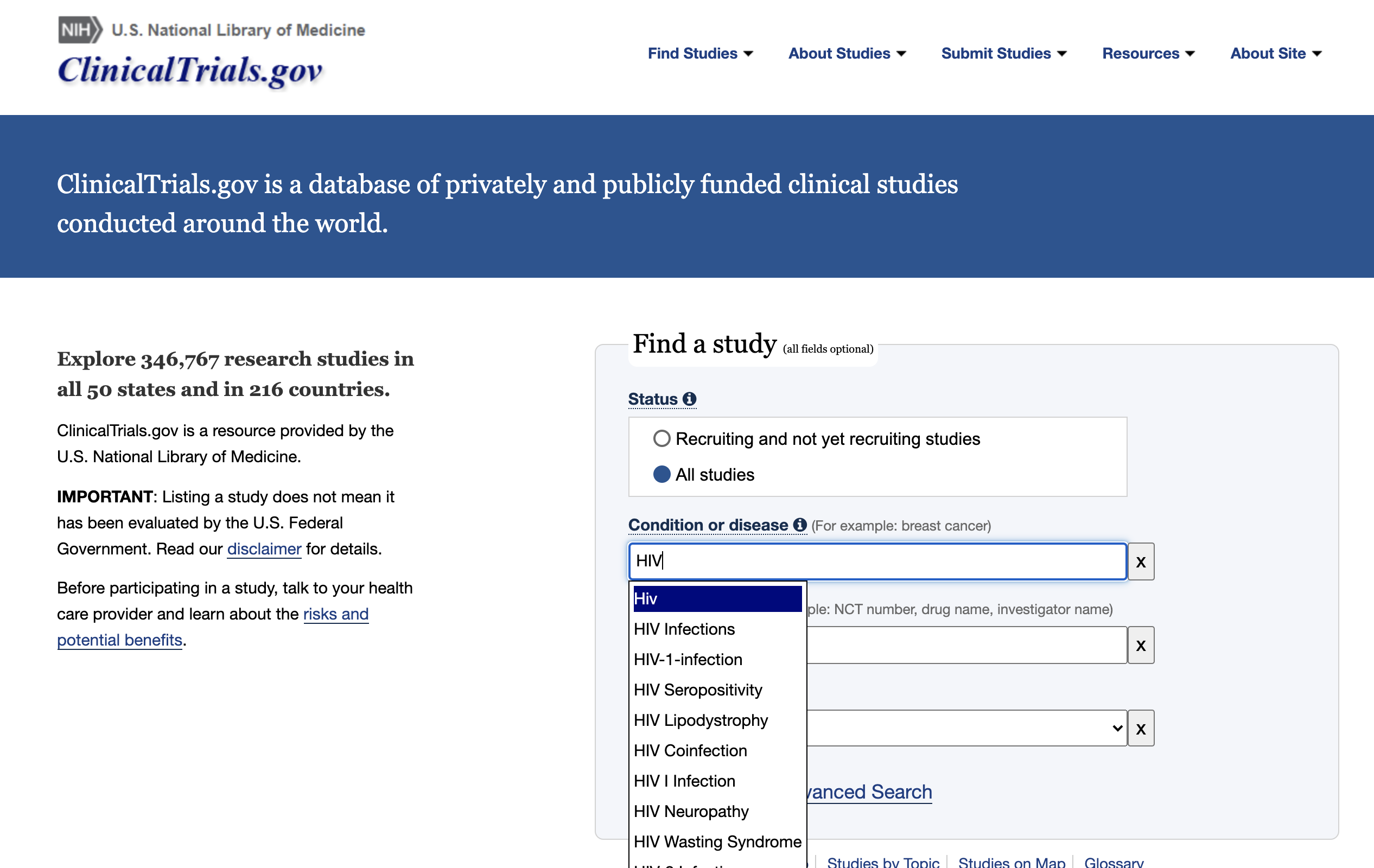 You are the head of an AIDS research program in a large pharma company. You can create a query on ClinicalTrials.gov to look into clinical trial news coming from other research labs.