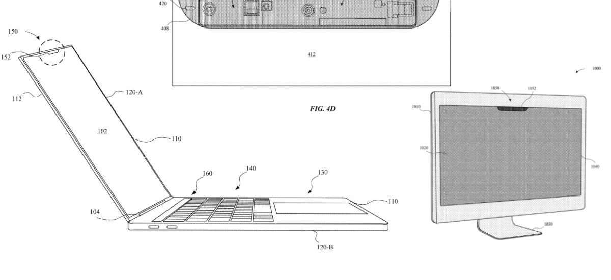 The patent document contains various diagrams of a hardware module that is capable of light pattern recognition. This hardware module — shown with a range of sensors in figure 4D — is shown to be located at the top of the display on a computer that looks like a MacBook in figure 1A and a desktop Mac computer in figure 10.