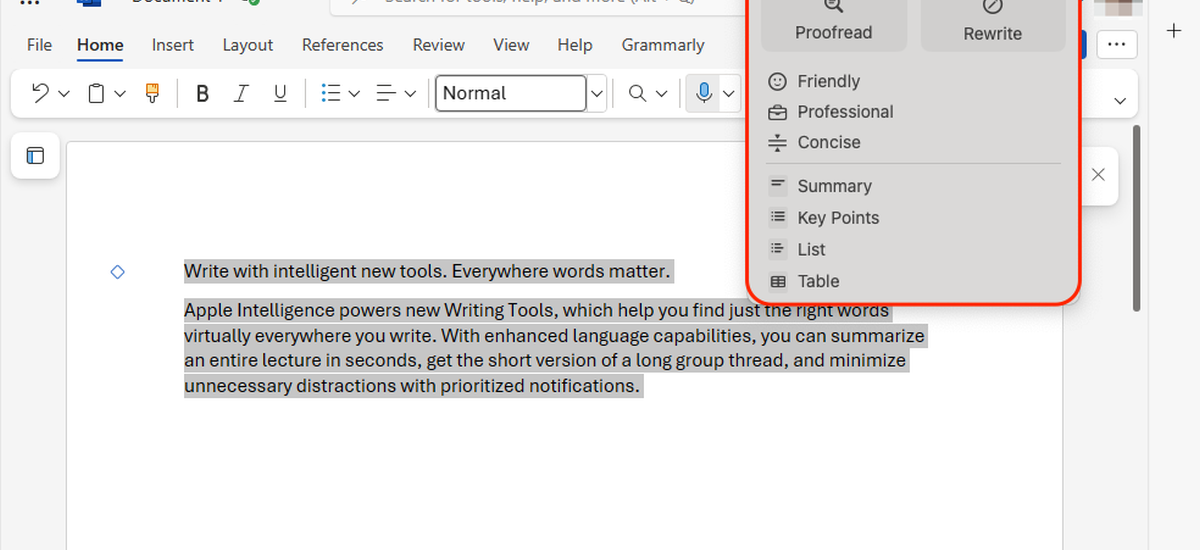 Once this process is complete, users can select a block of text inside an app like Microsoft Word running on their virtual machine on Parallels Desktop, then press the Shift + Command + W keyboard shortcut to access the Apple Writing Tools menu.