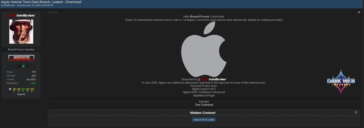 The dark web tracker shared a screenshot from the dark web forum BreachForums, where in a post, the hacker group said, “I’m releasing the internal source code to three of Apple’s commonly used tools for their internal site, thanks for reading and enjoy.” IntelBroker did not share any other details about the breach. It is also unclear whether the source code is being offered for free or if it is being sold. by the group.