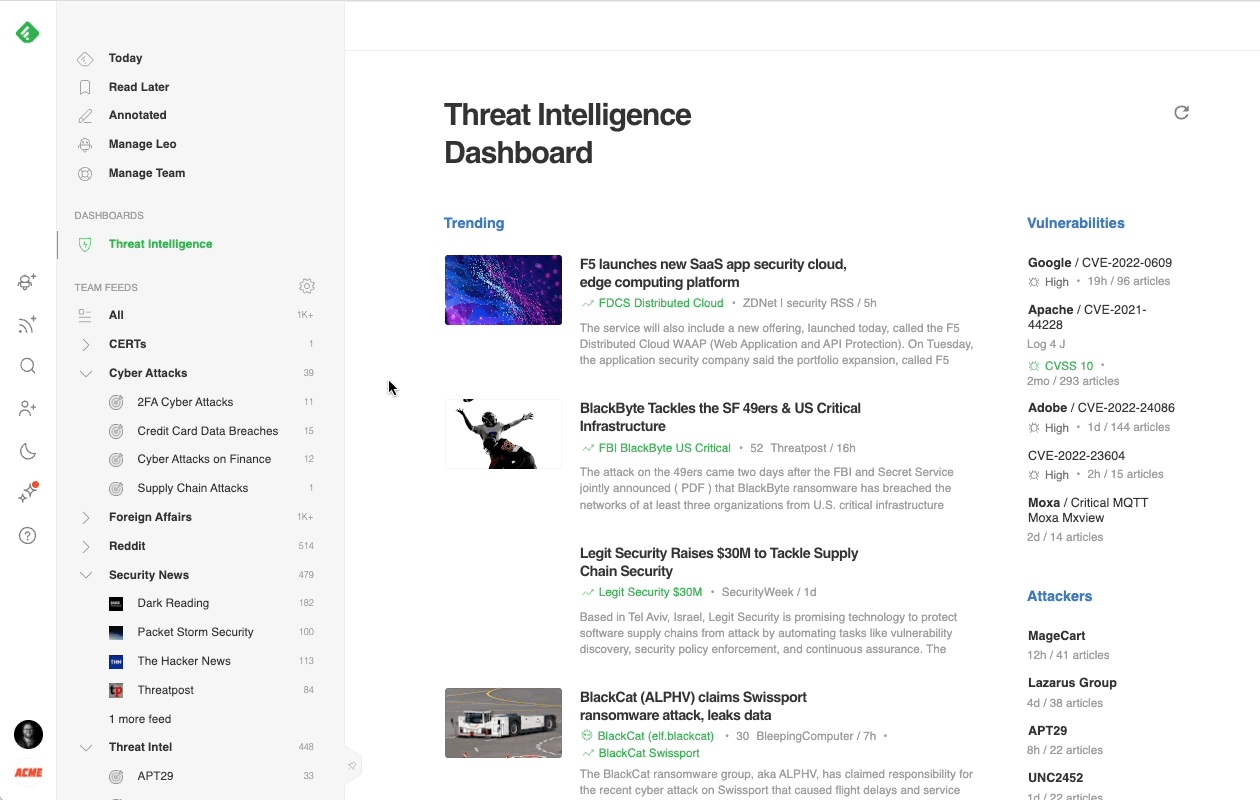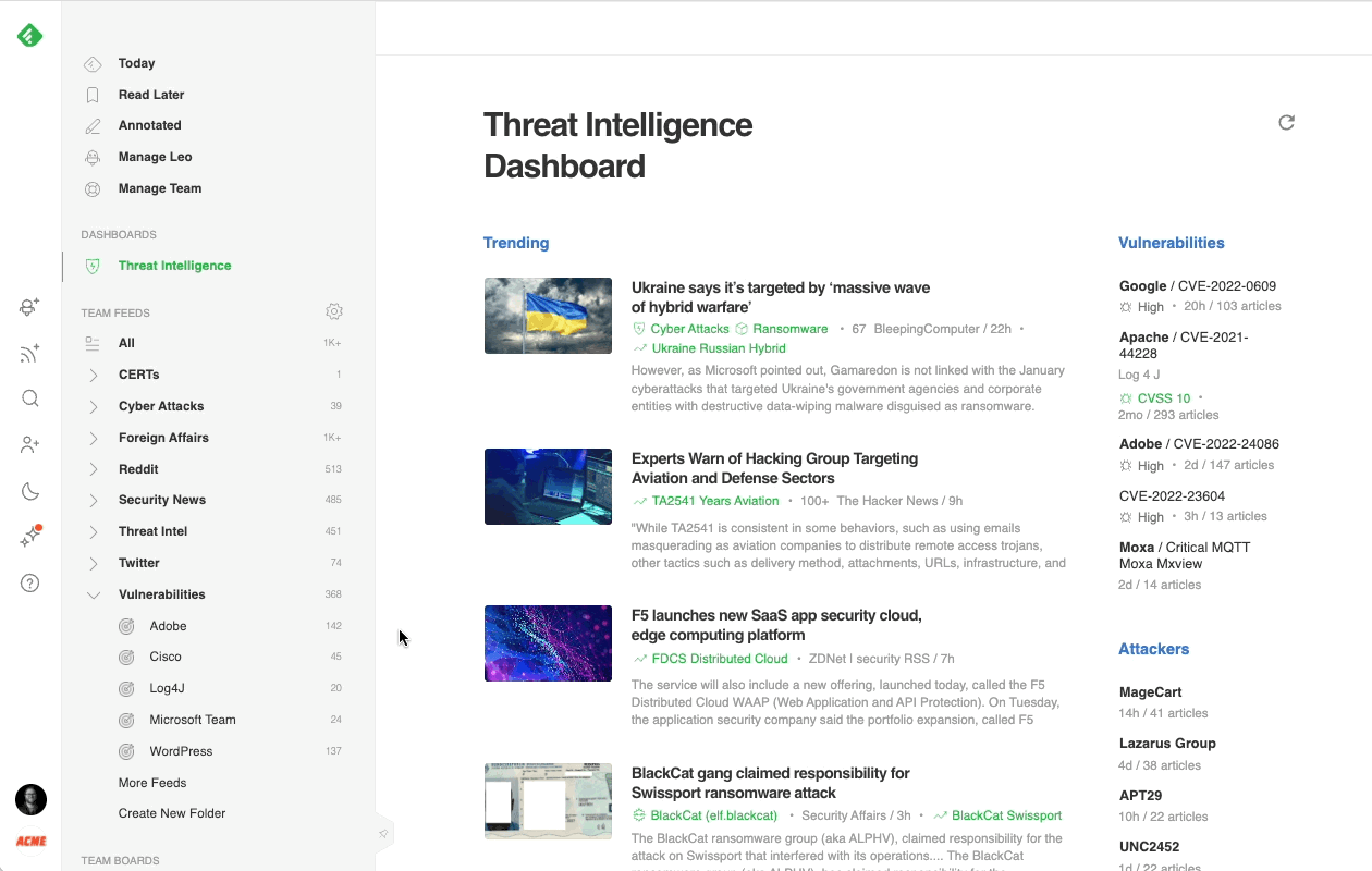The most effective way to track critical vulnerabilities and zero-days across the web is with Leo, Feedly’s AI research assistant. Leo has been pre-trained to understand vulnerabilities and assess their severity. He reads millions of articles every day, looking for critical security threats.