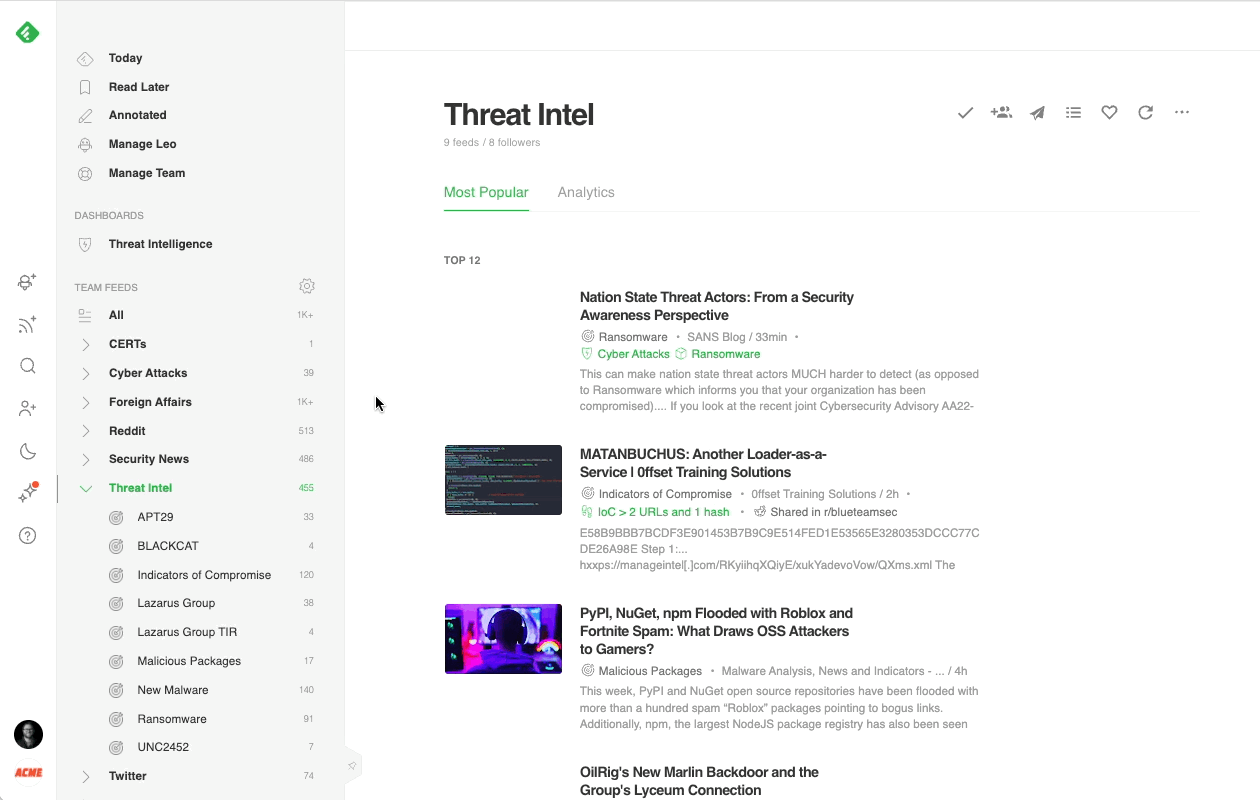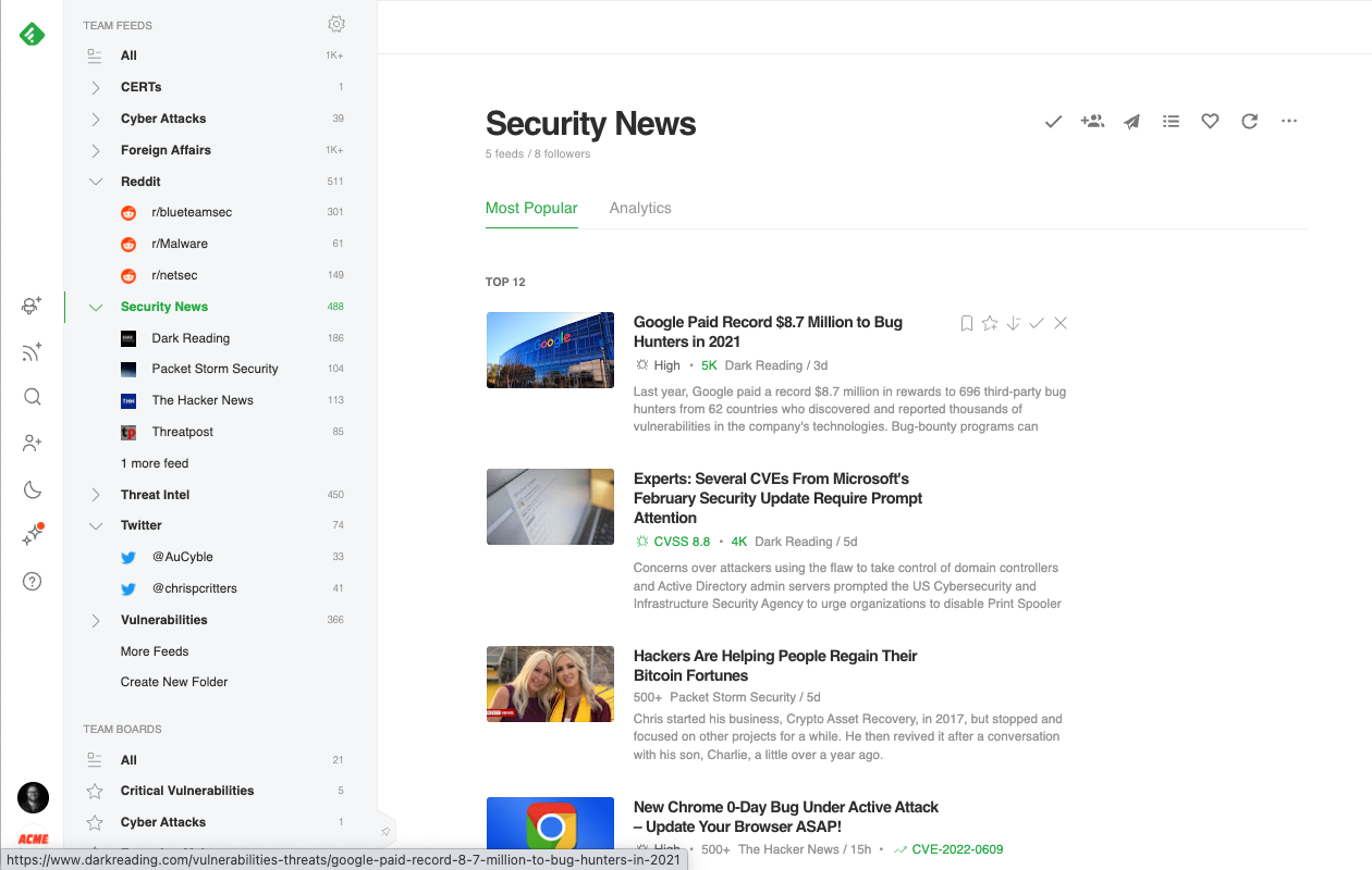 Feedly allows cybersecurity teams to follow a wide variety of trusted feeds all in one place, including websites and blogs, newsletters, Reddit communities, and Twitter accounts, searches, and hashtags. The teams that get the most out of Feedly turn it into their one-stop intelligence center so they can share common sources in one place. They end up saving hours each week because they’re no longer sharing articles ad-hoc across email, Slack, and other messaging platforms.