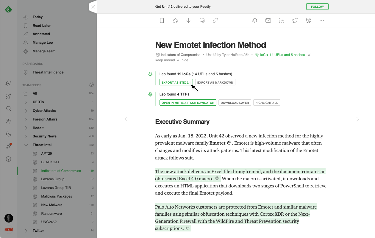 Leo also automatically flags all the malicious IPs, hashes, domains, and URLs (IoCs) he identifies in articles so that they can easily be exported with links to threat actors, malware families, and vulnerabilities using STIX 2.1 and imported into Threat Intelligence Platforms (TIP).