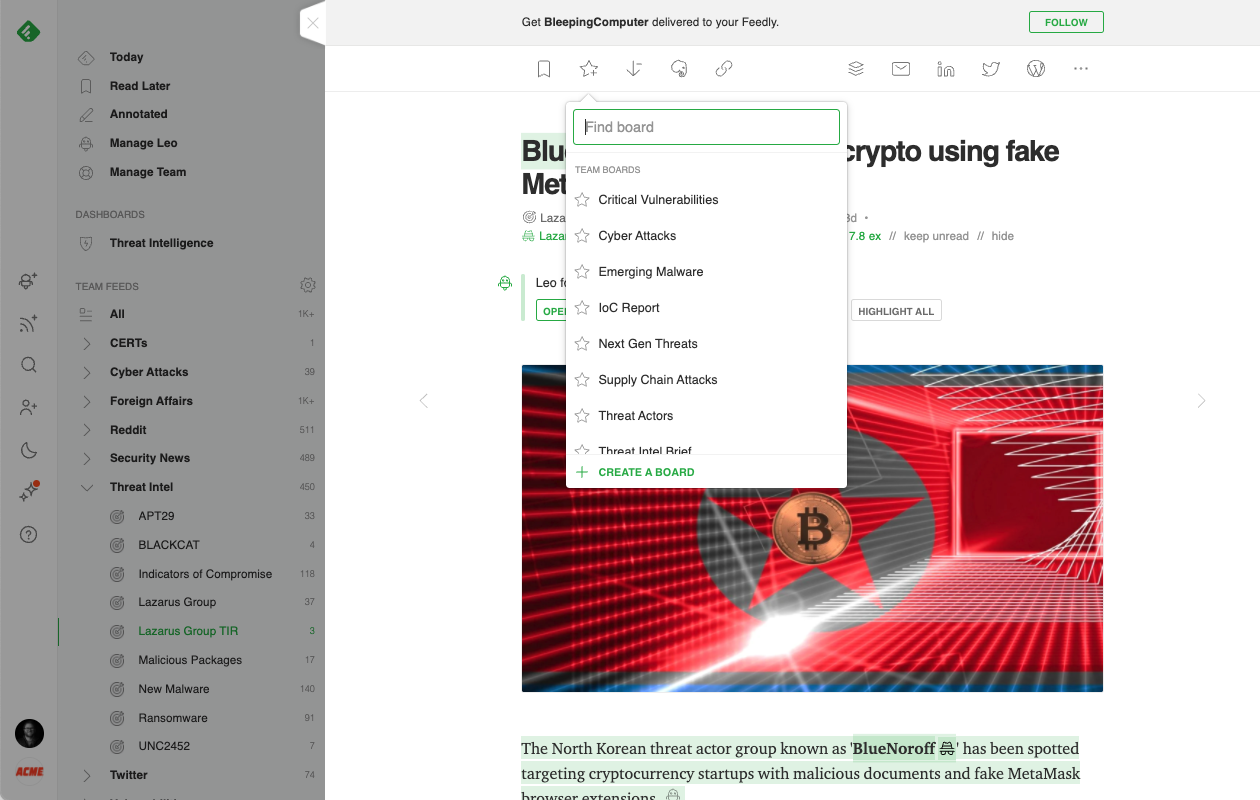 When an article of importance surfaces, Feedly provides the tools to annotate, highlight, add notes, and save the article to a Board for review later. When an article is saved to a Team Board, Feedly for Threat Intelligence users have additional options to auto-generate Newsletters, share with Slack or Microsoft Teams, or use Feedly’s Rest API to integrate into an existing workflow.