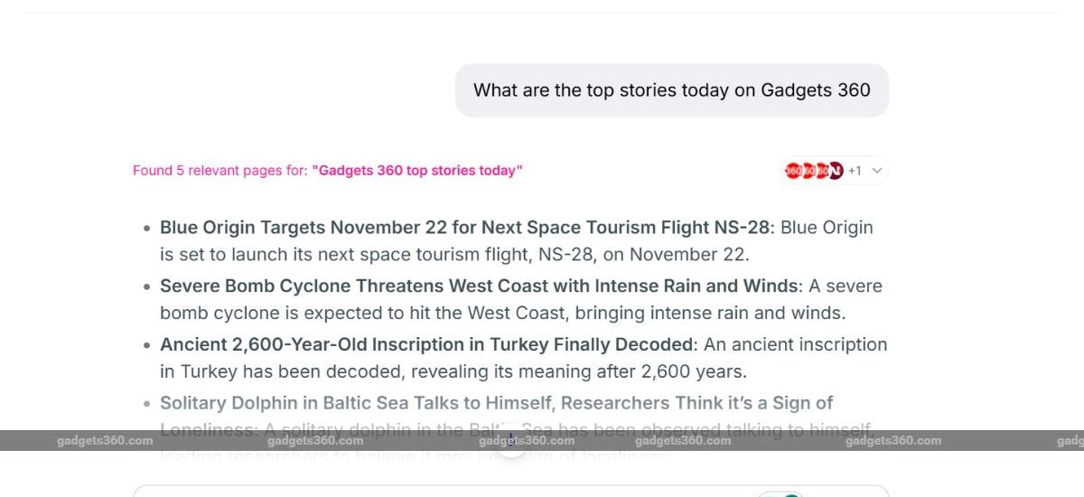 Gadgets 360 staff members were able to test the feature and found that users can ask multiple follow-up queries. The interface is minimal with fast inference time and processing speed. The chatbot also shows all the reference websites from where the information was sourced on top of the response. Additionally, it also issues a warning asking users to verify critical facts.