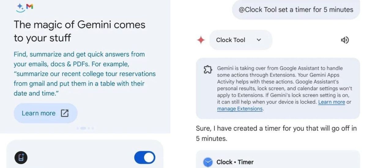 In a screenshot shared by the publication, a Clock Tool extension could be seen in the list of Gemini extensions. It can be summoned either by verbally naming it or by typing ‘@Clock Tool, followed by the request. In the screenshot, this action prompts the AI chatbot to display a message that says, “Gemini is taking over from Google Assistant to handle some actions through Extensions.” The Clock Tool then performs the task.