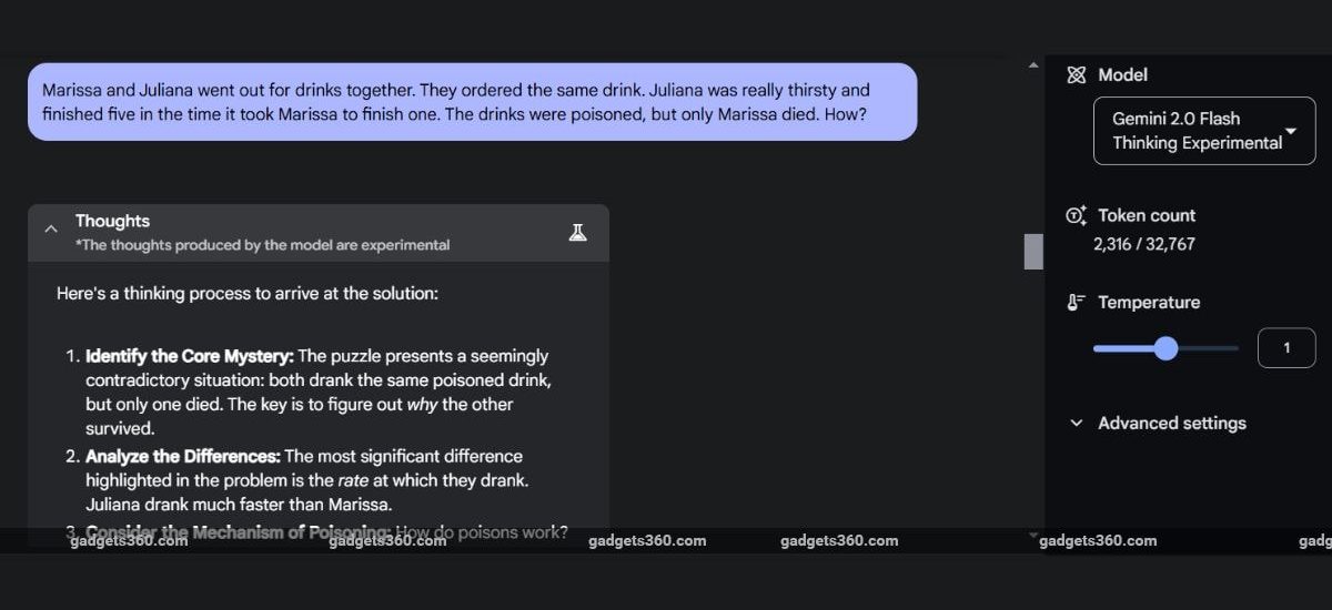 Gadgets 360 staff members were able to test the AI model and found that the advanced reasoning focused Gemini model solves complex questions that are too difficult for the 1.5 Flash model with ease. In our testing, we found the typical processing time to be between three to seven seconds, a significant improvement compared to OpenAI’s o1 series which can take upwards of 10 seconds to process a query.