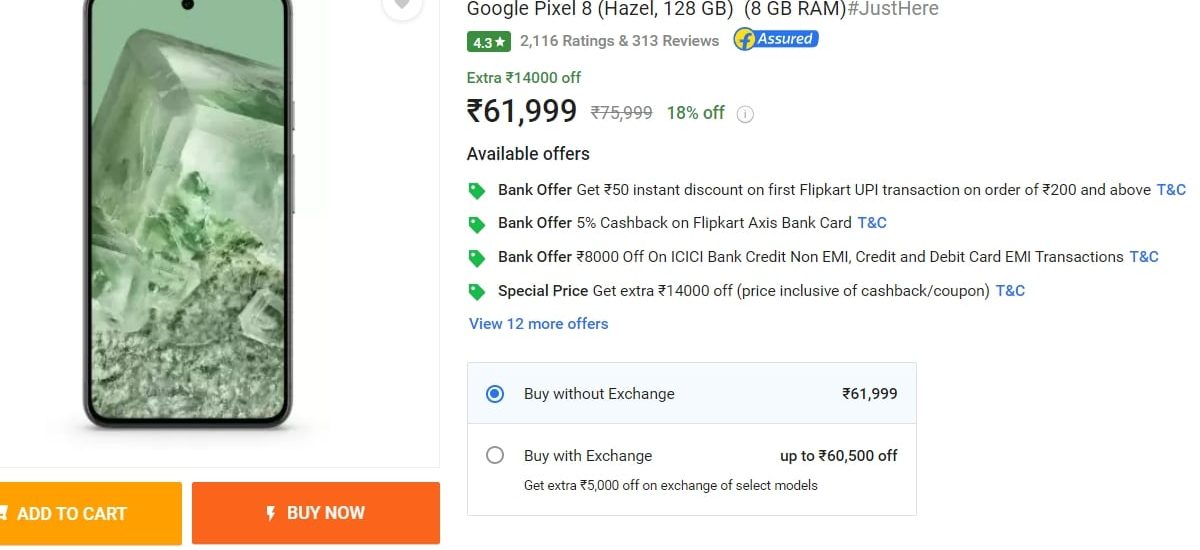 Additionally, Flipkart is offering hefty trade-in discounts of up to Rs. 60,500 on the Pixel 8. A cashback offer worth up to Rs. 8,000 can also be availed by customers purchasing the handset using ICICI bank cards and EMI transactions, effectively brining the starting price to Rs. 53,999.