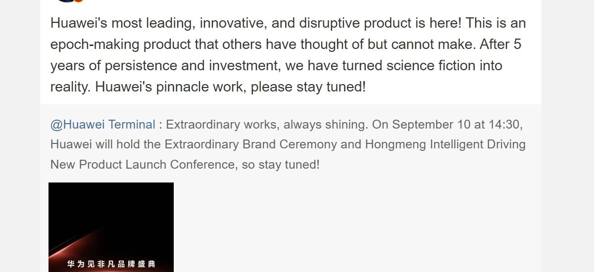 The Shenzhen-based conglomerate, and its Consumer Business Group CEO Richard Yu (aka Yu Chengdong) on Weibo announced that a new launch event will take place on September 10. This event will start at 2:30pm (12:00pm IST). The post says “Huawei will hold the extraordinary brand ceremony and HarmonyOS smart driving new product launch conference”. The event poster also shows the silhouette of a tri-folding smartphone. Owing to this, it is largely being speculated that Huawei’s tri-fold may break cover at the event.