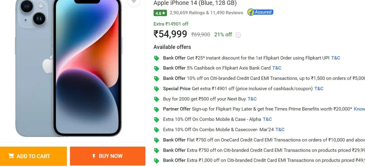 The iPhone 14 Blue colour variant with 128GB storage is currently listed at Rs. 54,999 on Flipkart, down from the launch price of Rs. 69,990. The 256GB and 512GB variants are listed at Rs. 68,999 and Rs. 88,999, respectively. Customers can avail up to Rs. 1,500 off on payments made through Citi branded credit card and EMI transactions. The e-commerce website is offering Rs. 750 cashback for customers purchasing the handset using OneCard credit cards. Further, there is up to Rs. 47,100 exchange discount. UPI transactions are eligible to get Rs. 500 off.