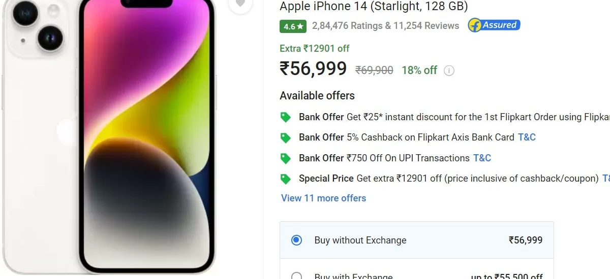 Six months after Apple released the iPhone 15 series, Flipkart has listed the base 128GB storage variant of the iPhone 14 at Rs. 56,999, down from the launch price of Rs. 69,990. The 256GB and 512GB variants are listed at Rs. 69,999 and Rs. 86,999, respectively. The e-commerce website is offering 5 percent cashback for customers purchasing the handset using Flipkart Axis bank cards. The EMI options start at Rs. 2,004 per month. Further, there is up to Rs. 55,500 exchange discount.