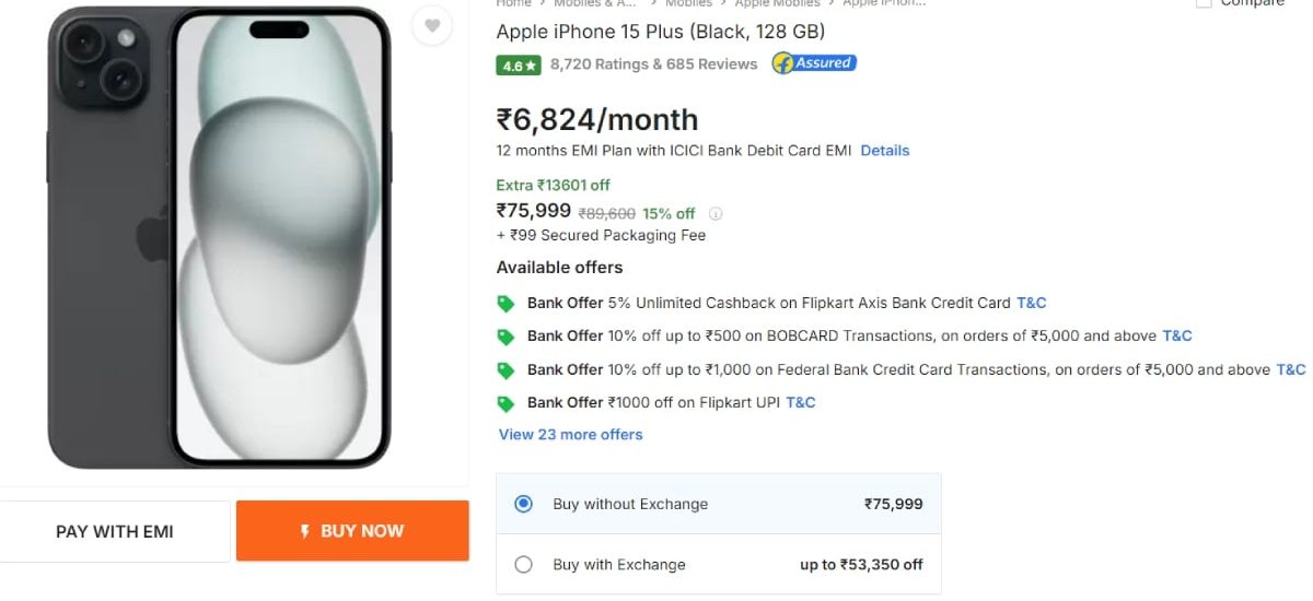 The iPhone 15 Plus is priced on the Apple India website at Rs. 89,600 for the base 128GB option. The same variant is currently listed on Flipkart with a Rs. 13,601 discount at Rs. 75,999. Additionally, customers can avail of an exchange offer to get the handset at an even lower effective price.