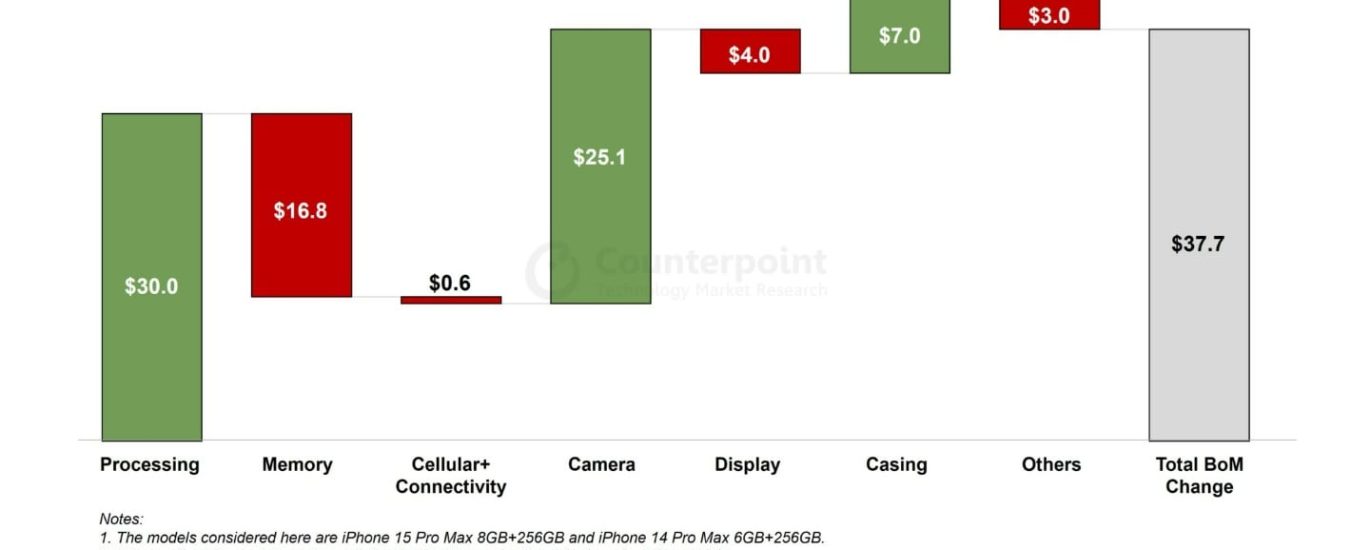 BoM cost difference by function: iPhone 15 Pro Max vs iPhone 14 Pro Max