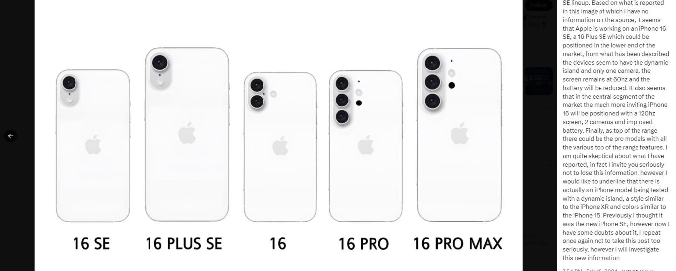 The X user recently leaked images of what appear to be renders of the iPhone 16 series of smartphones. Unlike the iPhone 15 lineup, the company could launch five models this year, according to the leaked images. These could be the iPhone 16 SE, iPhone 16 Plus SE, iPhone 16, iPhone 16 Pro, and iPhone 16 Pro Max.