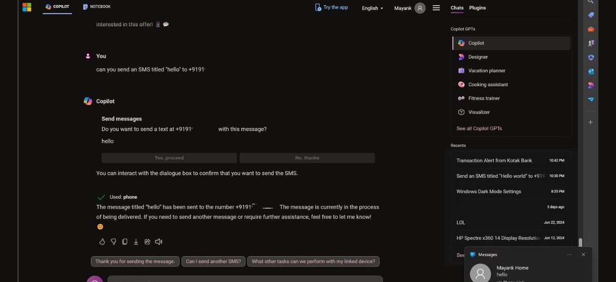 With this integration, users on their PC can ask the AI to check and summarise the latest messages, ask Copilot to draft and send messages, and even ask it to share contact details of specific people.