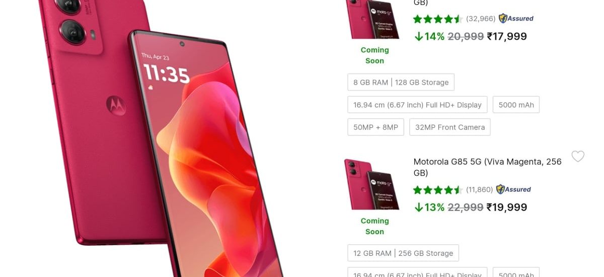 Motorola launched the Moto G85 5G in India at a price of Rs. 17,999 for the base 8GB + 128GB option, while the 12GB + 256GB variant is marked at Rs. 19,999. The teased Viva Magenta option is listed on Flipkart at similar prices as well.