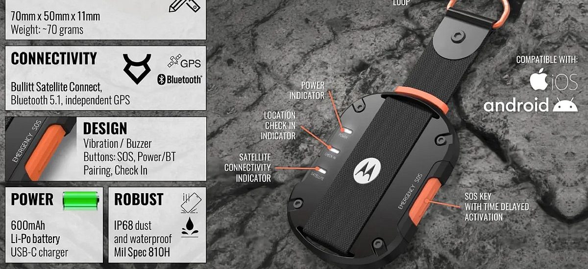 According to the company, the Motorola Defy satellite link is a Bluetooth accessory that connects to a smartphone running Android 10 and iOS 14 or later. A handset that is linked to the device can access the Bullitt Satellite Messenger service to access two-way satellite messaging, location sharing, and the SOS Assist feature.