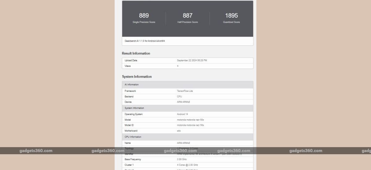 While Gadgets 360 staff members were unable to verify the Geekbench 6.3.0 scores, we managed to get our hands on the Geekbench AI scores of the handset. In this listing, the purported Motorola Razr 50s had a score of 889 in the single precision test. Meanwhile, the half-precision and the quantised scores came out to be 887 and 1,895 points, respectively.