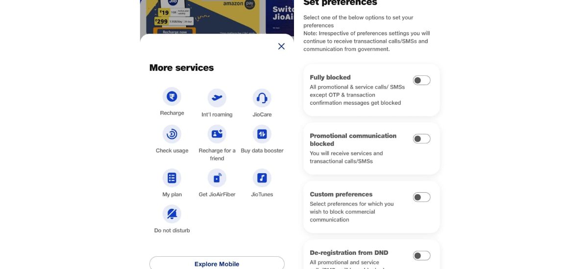 MyJio application users can now block all promotional content or personalise their DND settings to block select modes of communication or certain kinds of promotions. On the home page of the MyJio app, users will have to click on the More > DND options and then choose their preferences.