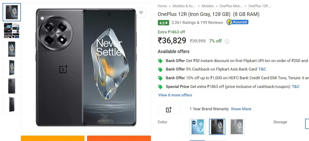 Flipkart has listed the base 8GB RAM + 128GB storage variant of the OnePlus 12R at Rs. 36,829, instead of the original launch price of Rs. 39,999. The e-commerce website is also offering up to Rs. 1,250 discount for customers purchasing the handset using HDFC credit card EMI transactions. Clubbing both the offers would bring down the effective price to Rs. 35,579. Further, there is a special discount of Rs. 1,863. Flipkart Axis bank users can avail 5 percent cashback. The EMI options start at Rs. 1,295 per month.