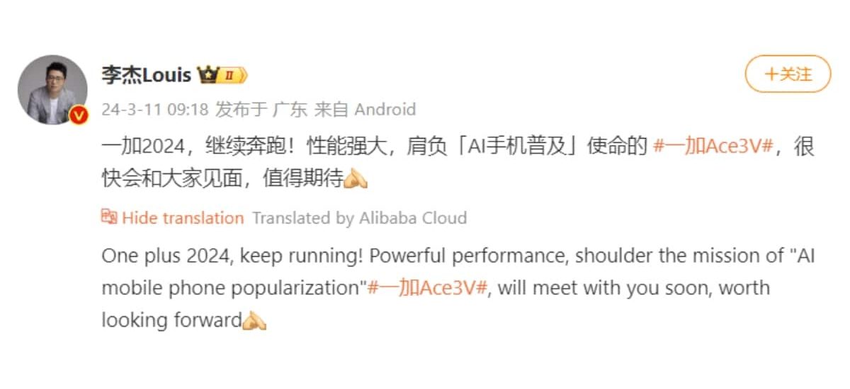 OnePlus China President Li Jie announced via a Weibo post that the OnePlus Ace 3V will be unveiled in 2024. He did not confirm a specific timeline for the launch but said that it is expected to arrive in the markets “soon.” He also teased that it will be a model equipped with AI-backed features.