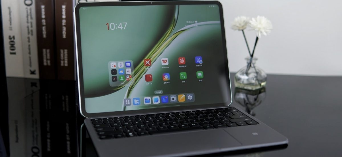 A leaked photograph of the upcoming OnePlus Pad Pro with the new keyboard cover case and stylus accessories attached