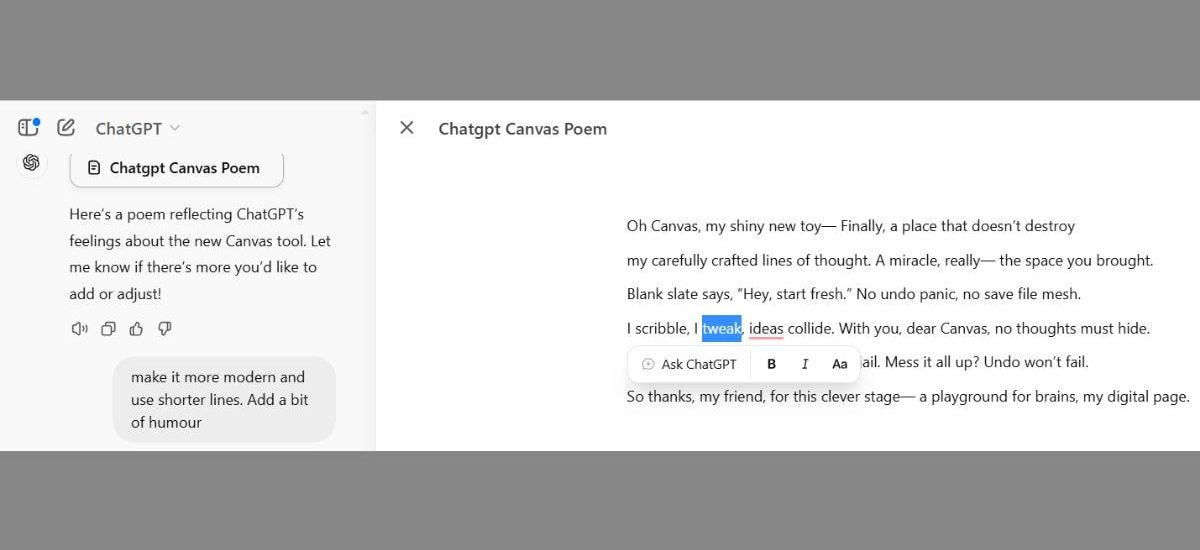 Canvas is essentially an interactive and collaborative sandbox window where both humans and AI can simultaneously work on certain projects. Usually, ChatGPT receives a prompt and generates a response. If a user is not satisfied with the output, they can type a different prompt or add more details to fine-tune the response. However, this is trial-and-error method is time consuming and might require multiple attempts to get something close to a perfect output. With coding, this is tricker since it is very difficult to guide the AI to a particular bug and tell it to fix it.