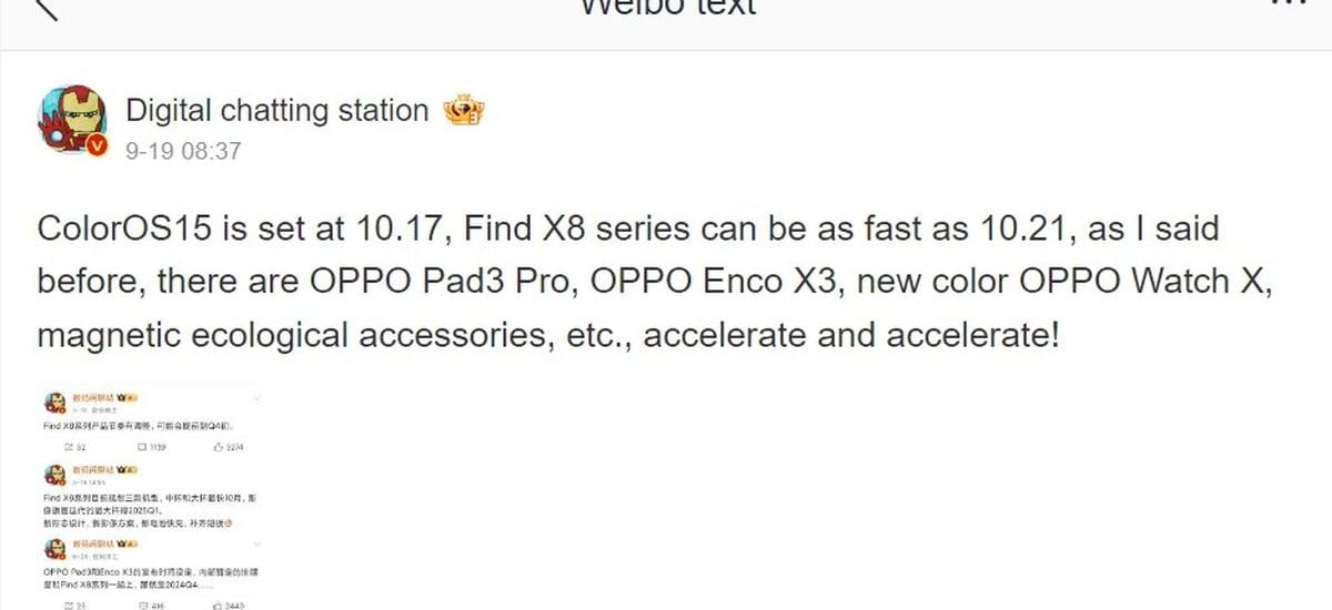 Oppo Find X8 series will be launched in China on October 21 “at the earliest”, according to a post by tipster Digital Chat Station (translated from Chinese) on Weibo. The handset is likely to arrive a few days after the release of Android 15-based ColorOS 15, which is expected to be released on October 17.