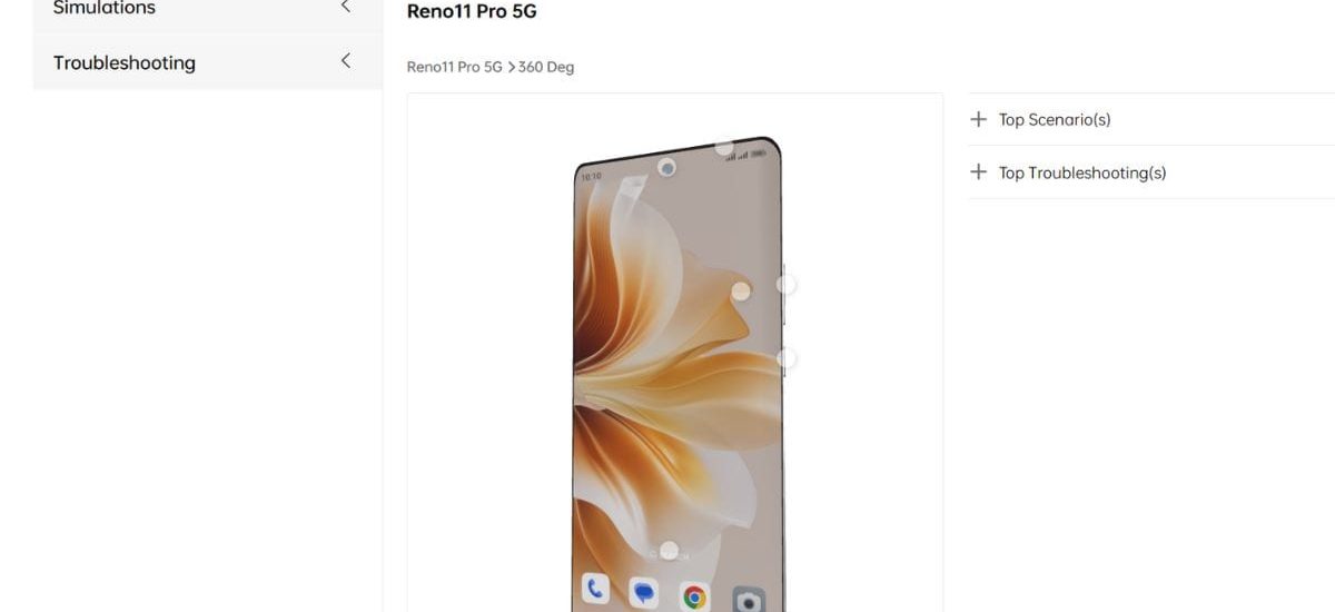 Once on the home page of the platform, users will need to select their smartphones. After that, they will be redirected to a page with the smartphone visible in a 3D view, and two menu options of Simulations and Troubleshooting. There is also an option to check the complete specifications of the phone on the top right.