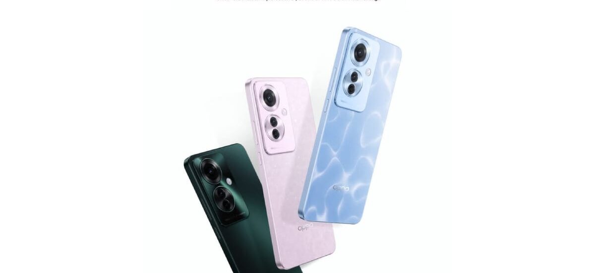 A promotional poster of the Oppo Reno 11F 5G shared on X shows the handset in three colour options – blue, green, and pink. The phones appear with shiny rear panels. The blue variant is seen with water ripple-like patterns. A raised rectangular camera island is seen on the top left corner of the back panel housing two smaller circular modules, one with two camera sensors and the other with the third one, placed alongside an LED flash unit. The brand logo appears towards the bottom. The power button and volume rocker are seen on the right edge.
