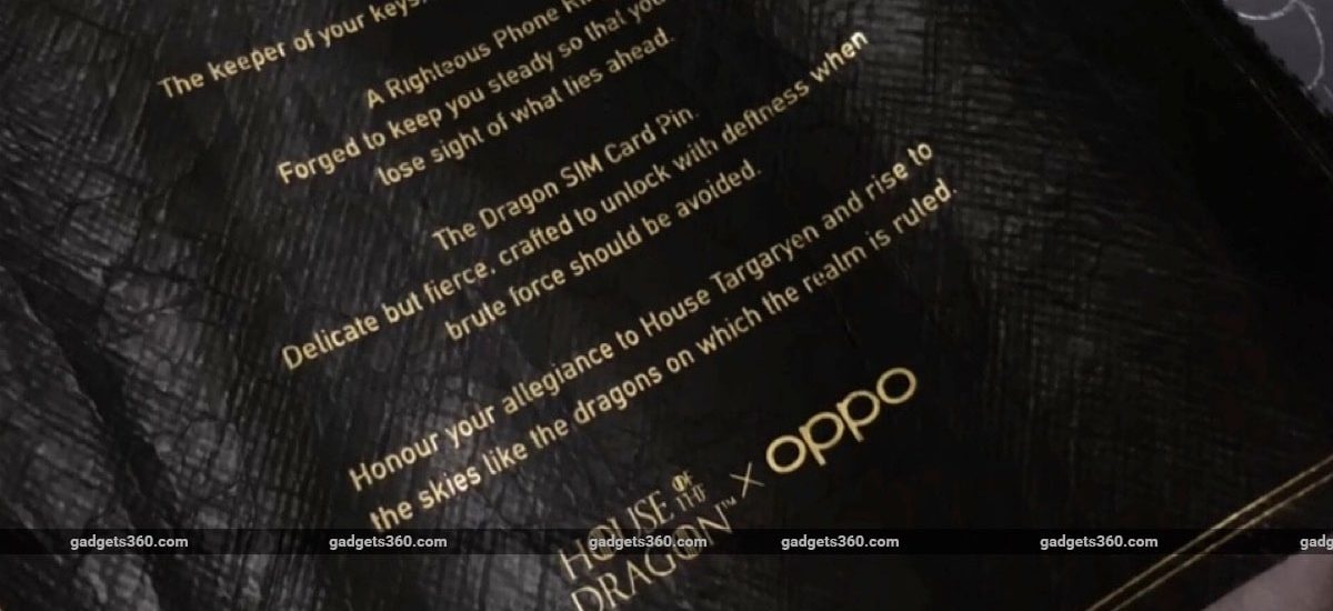 The Oppo Reno 8 Pro 5G House of The Dragon Limited Edition comes in a sizeable black box with a dragon-scale-inspired texture and the dragon logo embossed in gold at the top. Opening the flap reveals a knotted scroll tucked neatly within a compartment along with a ‘House of the Dragon X Oppo’ insignia. The scroll contains information about the box’s contents in a style reminiscent of the TV show.