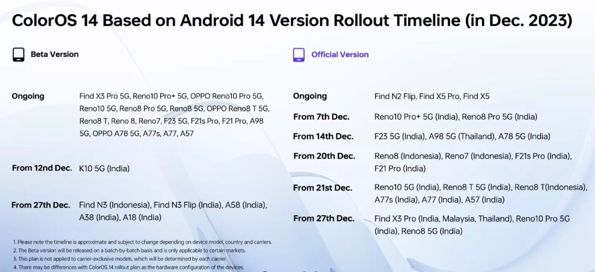 Oppo introduced the Android 14-based ColorOS 14 skin earlier this year. It brings a new Trinity Engine to boost the phone’s performance and an improved Aquamorphic Design. The stable version of the ColorOS 14 update had already started rolling out globally in November to some devices. The company has now announced the December rollout timeline of this version. According to the announcement, the stable ColorOS 14 update is now rolling out to Oppo Reno 8 Pro and Oppo Reno 10 Pro+ users in India.
