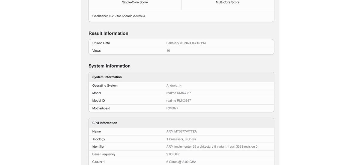 The Realme 12+ 5G with the model number RMX3867 has been listed (first spotted by Nashville Chatter) on Geekbench. The phone was previously also spotted on India’s BIS website with the same model number. In the Geekbench listing, the handset is seen with an octa-core chipset with the codename MT6877V/TTZA, which suggests that it is the MediaTek Dimensity 1080 SoC, also found on the Samsung Galaxy A34 5G and Redmi Note 12 Pro models. The variant seen on the listing is likely the 12GB RAM option.