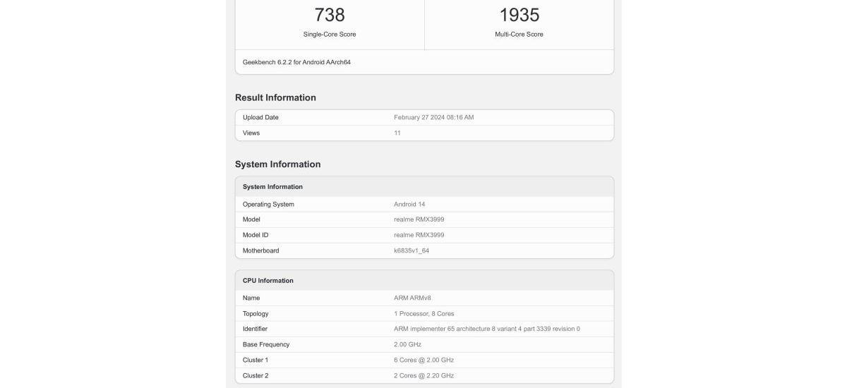 A Realme smartphone with the model number RMX3999 was spotted on Geekbench. A MySmartPrice report claims it is the Realme 12 5G model. The phone is seen with an octa-core chipset which is likely to be the MediaTek Dimensity 6100+ SoC, as per the report. It scored 738 points on the single-core test and 1,935 points on the multi-core test.