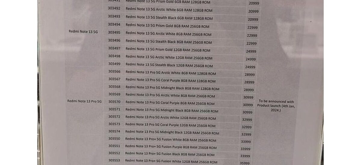 The top-of-the-line Redmi Note 13 Pro+ 5G, is expected to be available in three configurations. As per the leak, the 8GB + 256GB, 12GB + 256GB and 12GB + 512GB variants will likely be offered at Rs. 33,999, Rs. 35,999 and Rs. 37,999, respectively. This model is said to launch in India in Fusion White, Fusion Purple, and Fusion Black colourways.