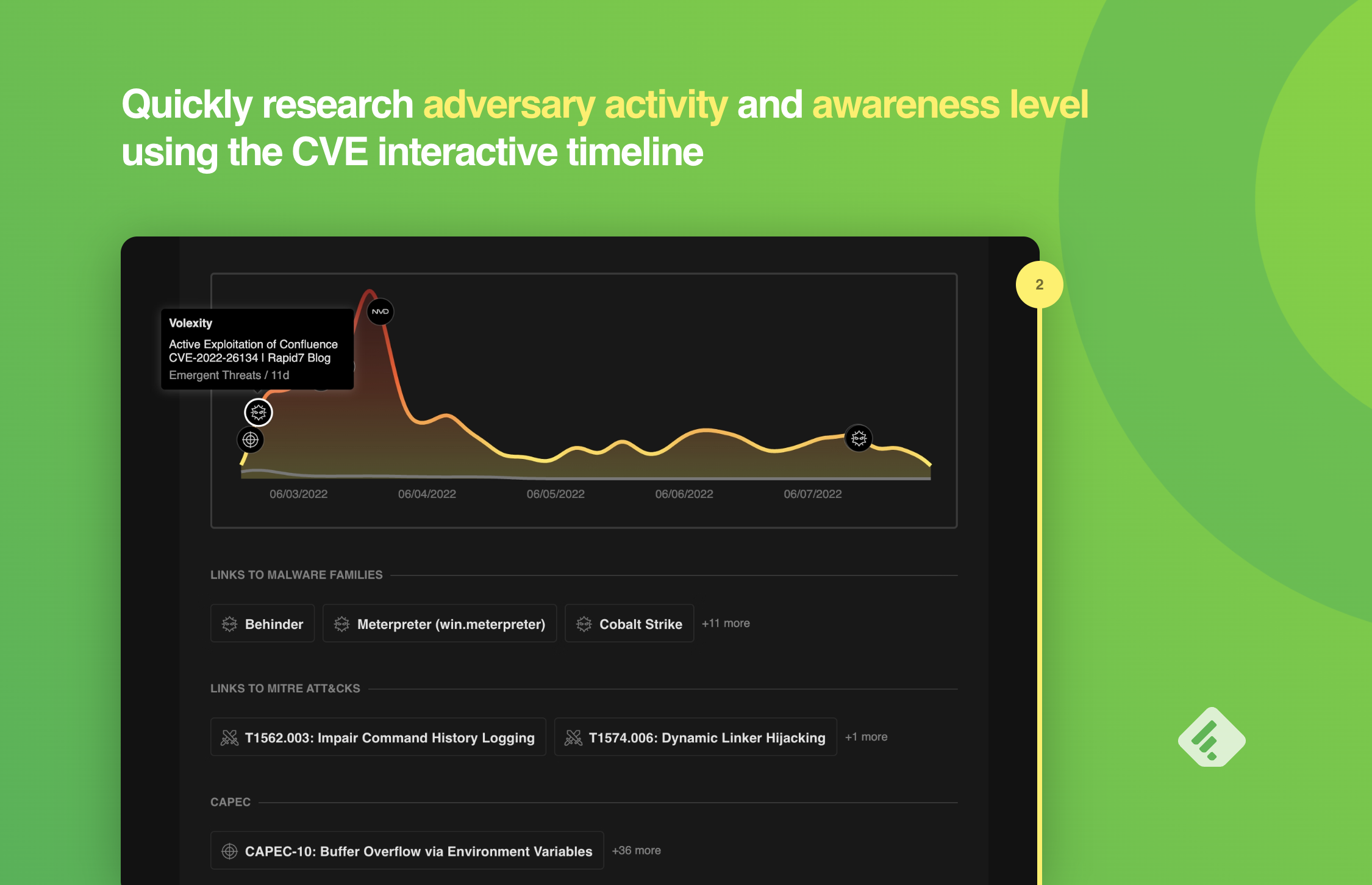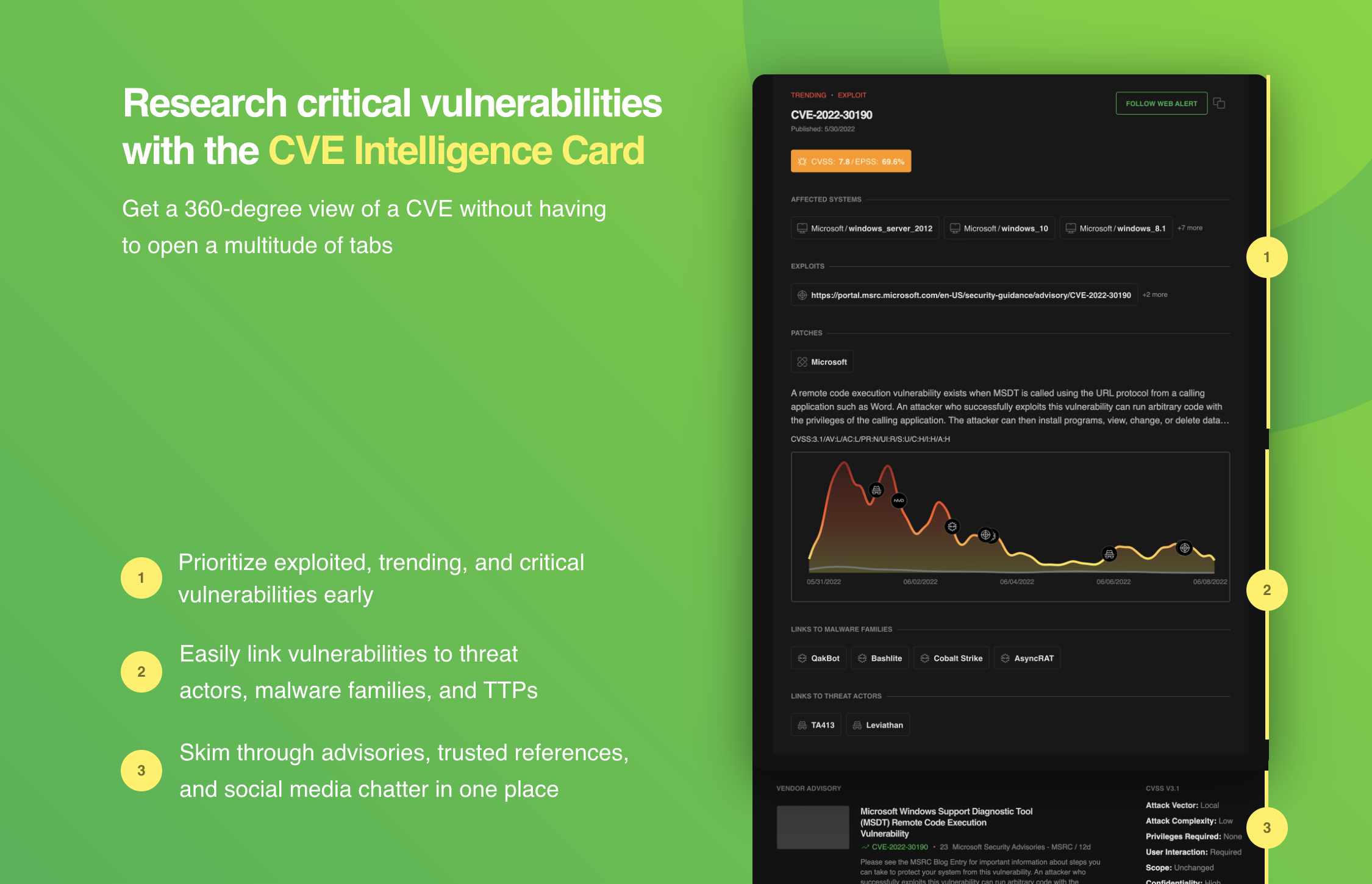 - Easily link vulnerabilities to threat actors, malware families, and TTPs