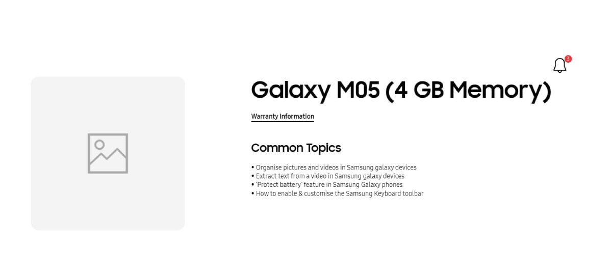 An official support page for the Samsung Galaxy M05 has gone live on the Samsung India website. This listing hints at an imminent India launch of the Galaxy M04 successor. It also hints that the smartphone supports 4GB of RAM. No other specifications of the handset have been listed on the page.
