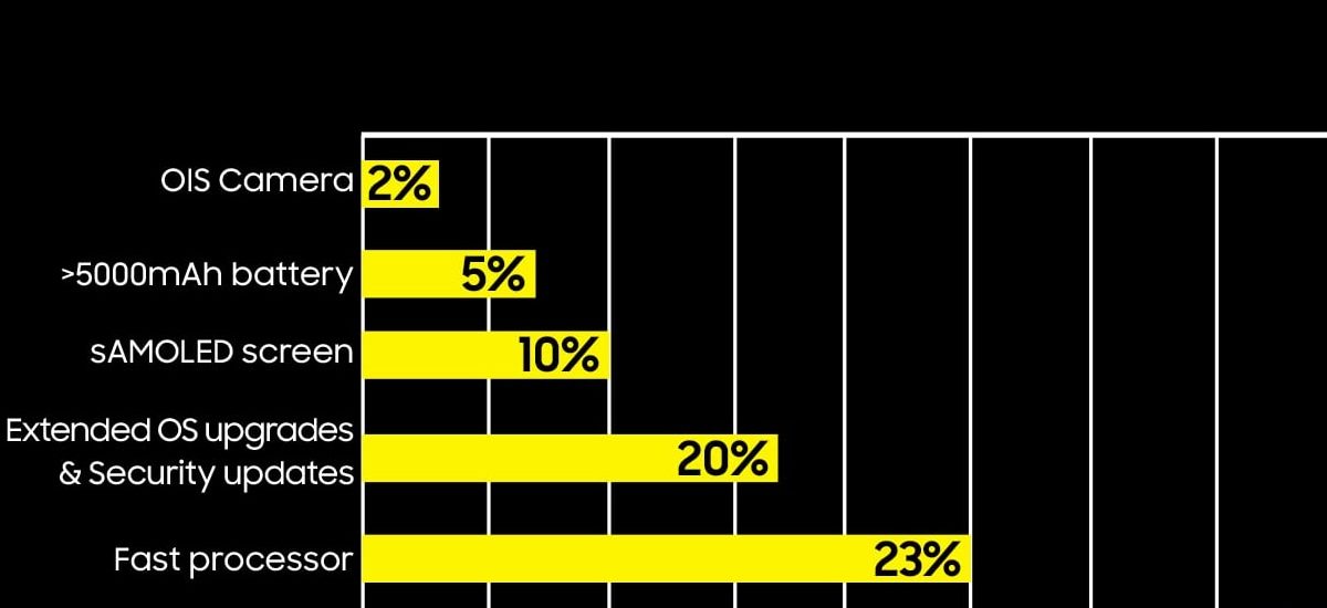 As per the Galaxy M34 5G microsite on Amazon, Samsung conducted a survey among users to find out the most preferred smartphone features. In the survey, two percent choose a camera setup with OIS (Optical Image Stabilisation) whereas five percent opted for more than 5,000mAh battery capacity. A Super AMOLED screen is preferred by 10 percent of the participants while 20 percent want extended OS upgrades and security updates. Additionally, 23 percent of users voted for a fast processor. A large 40 percent of participants favoured all the above-mentioned specifications in a smartphone.