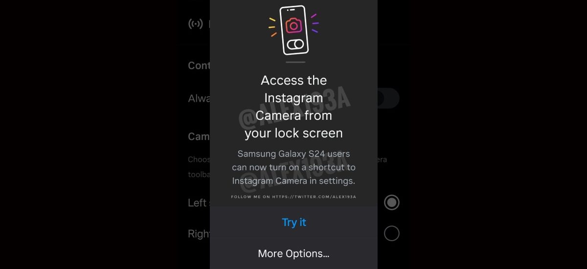 A user on X, Alessandro Paluzzi (@alex193a), shared a screenshot that suggested that the Galaxy S24 will allow an Instagram camera shortcut on its lock screen. Once a Galaxy S24 user opens the Instagram application for the first time, a pop-up dialogue box will offer them the choice to turn on Instagram Camera shortcut on their handsets, according to the image.