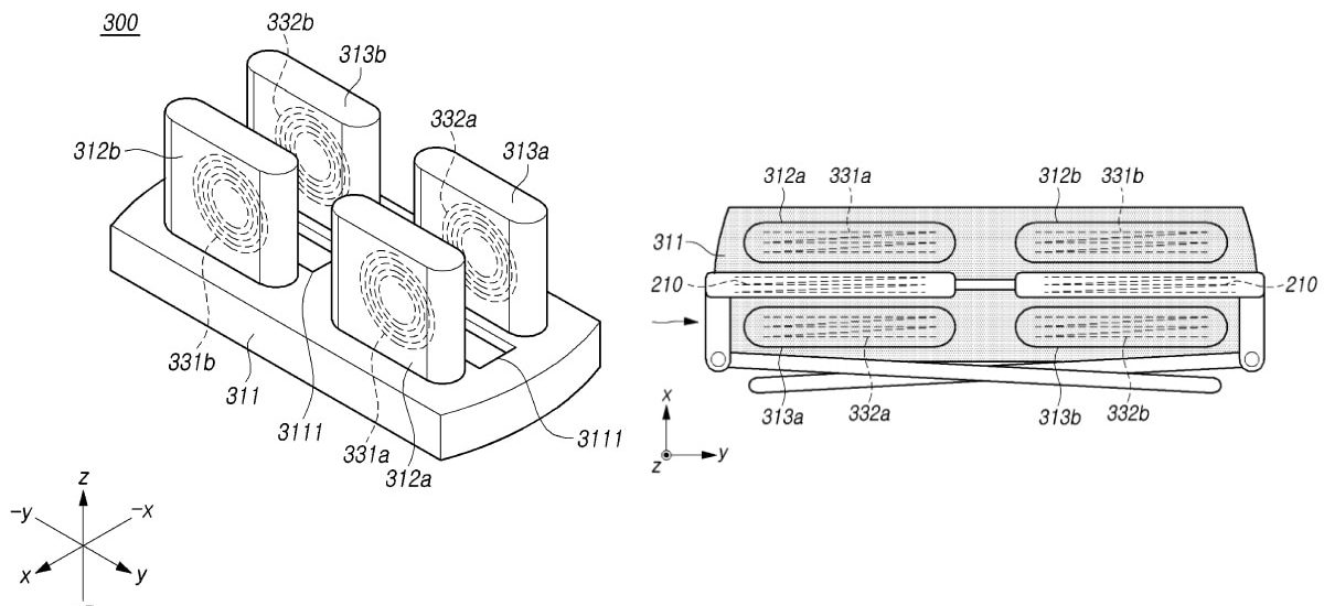 In the various diagrams included in the patent document, Samsung describes the use magnetic coils to transmit power to a receiving device which also has a magnetic coil for wireless charging. These coils are shown to be in alignment with the lenses of the AR glasses in Fig 9a, in a horizontal orientation