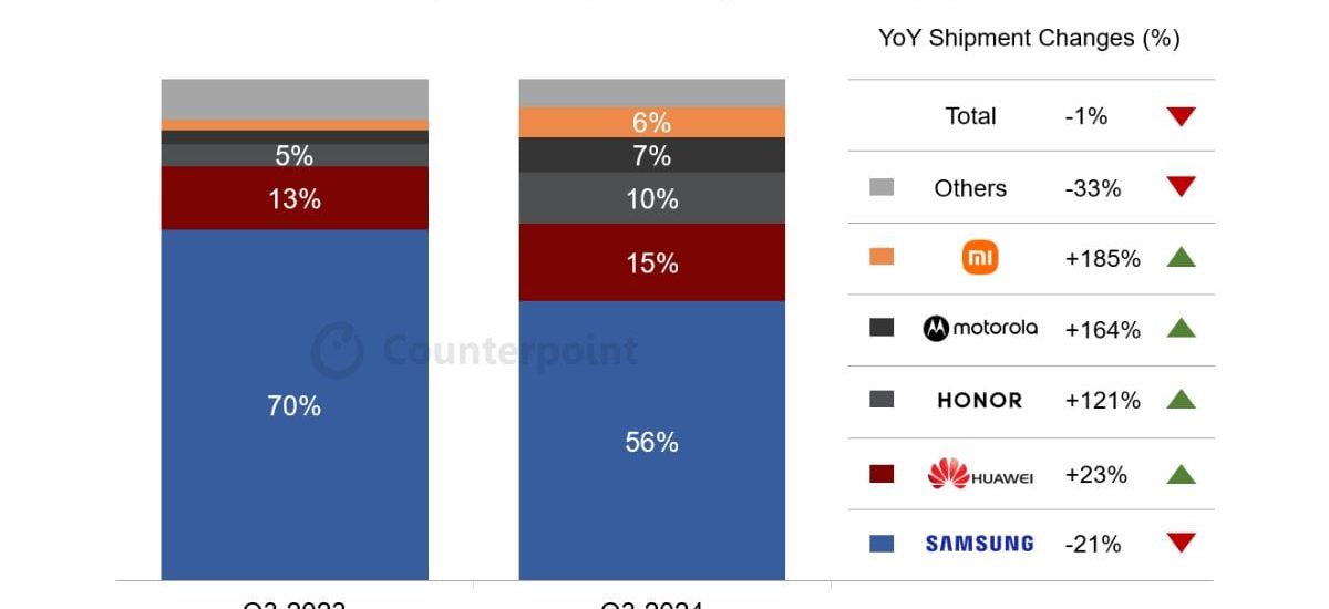 According to a report by Counterpoint Research, Q3 2024 marked the first-ever decline in global foldable smartphone shipments. Samsung’s poor performance of its flagship Galaxy Z Fold 6 and Galaxy Z Flip 6 is attributed as one of the possible causes behind this decline. Despite this, the South Korean technology conglomerate had a market share of 56 percent — shipping more devices than its rivals by a massive margin.