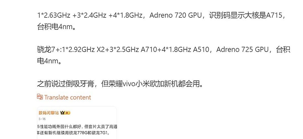 According to details shared by tipster Digital Chat Station (translated from Chinese) on Weibo, Qualcomm’s purported Snapdragon 7 Gen 3 is an octa-core chipset with an Adreno 720 GPU. It will be equipped with a Cortex-A715 prime core clocked at 2.63GHz, three performance cores, and 4 efficiency cores clocked at 2.4GHz and 1.8GHz, respectively.