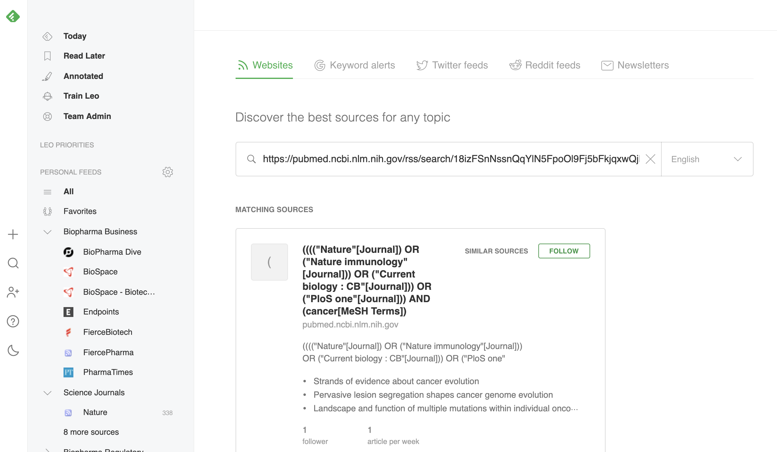 Add your custom PubMed RSS feed to your Feedly