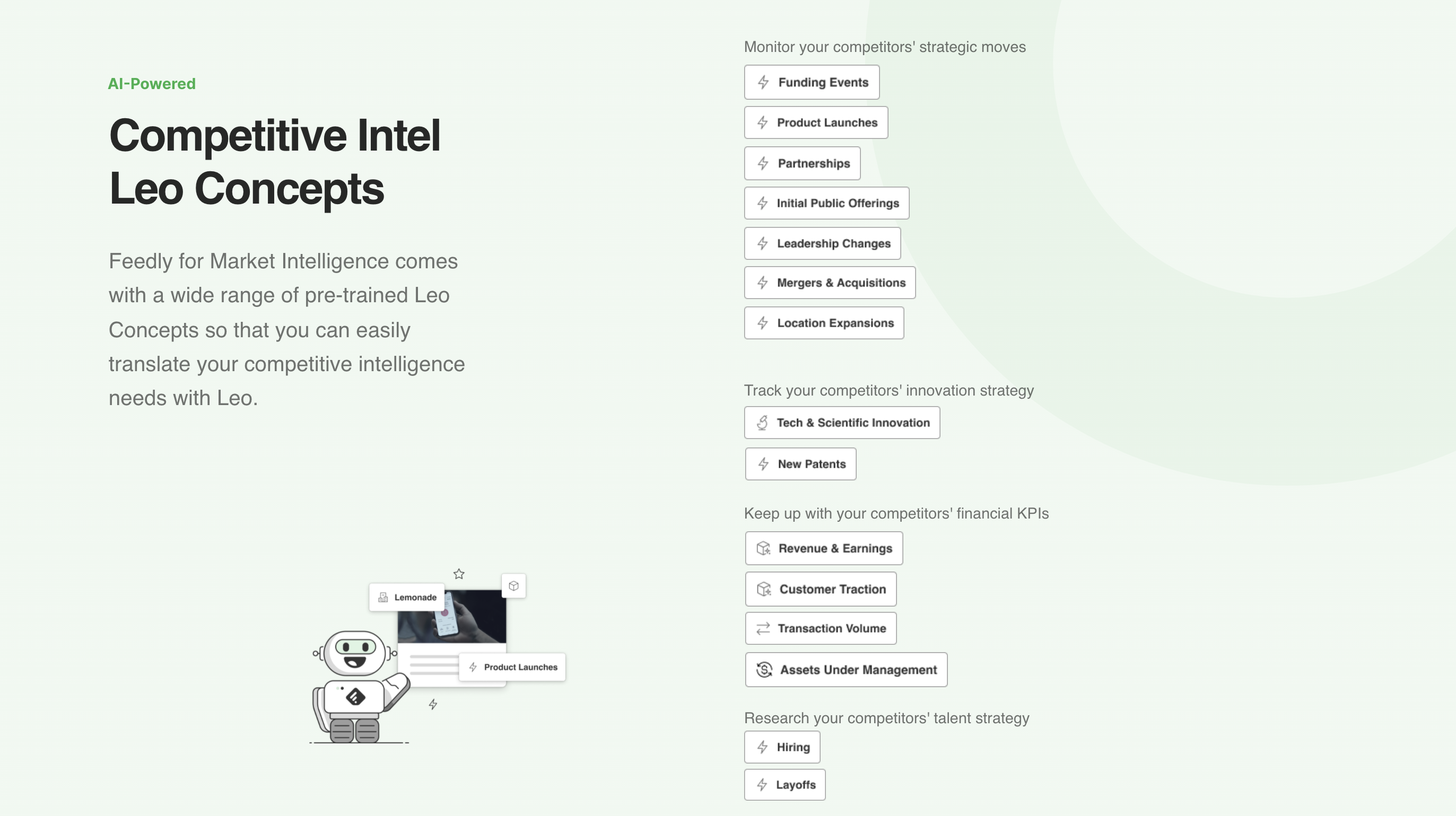 Tracking the strategic moves of your competitors can be tedious and overwhelming. That’s why Feedly has created Company Leo Concepts, which tracks competitor decisions and actions using Artificial Intelligence, saving your team hundreds of hours.