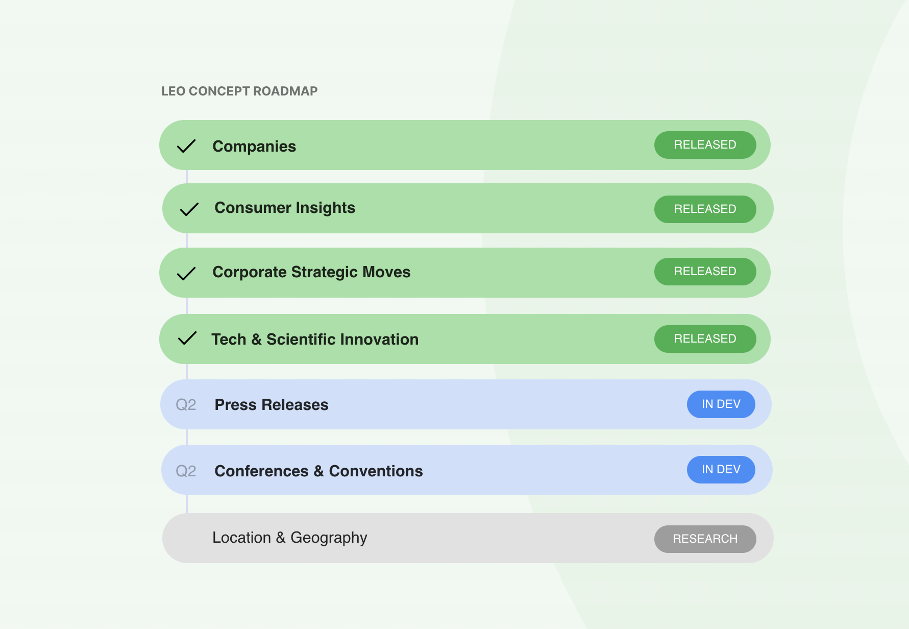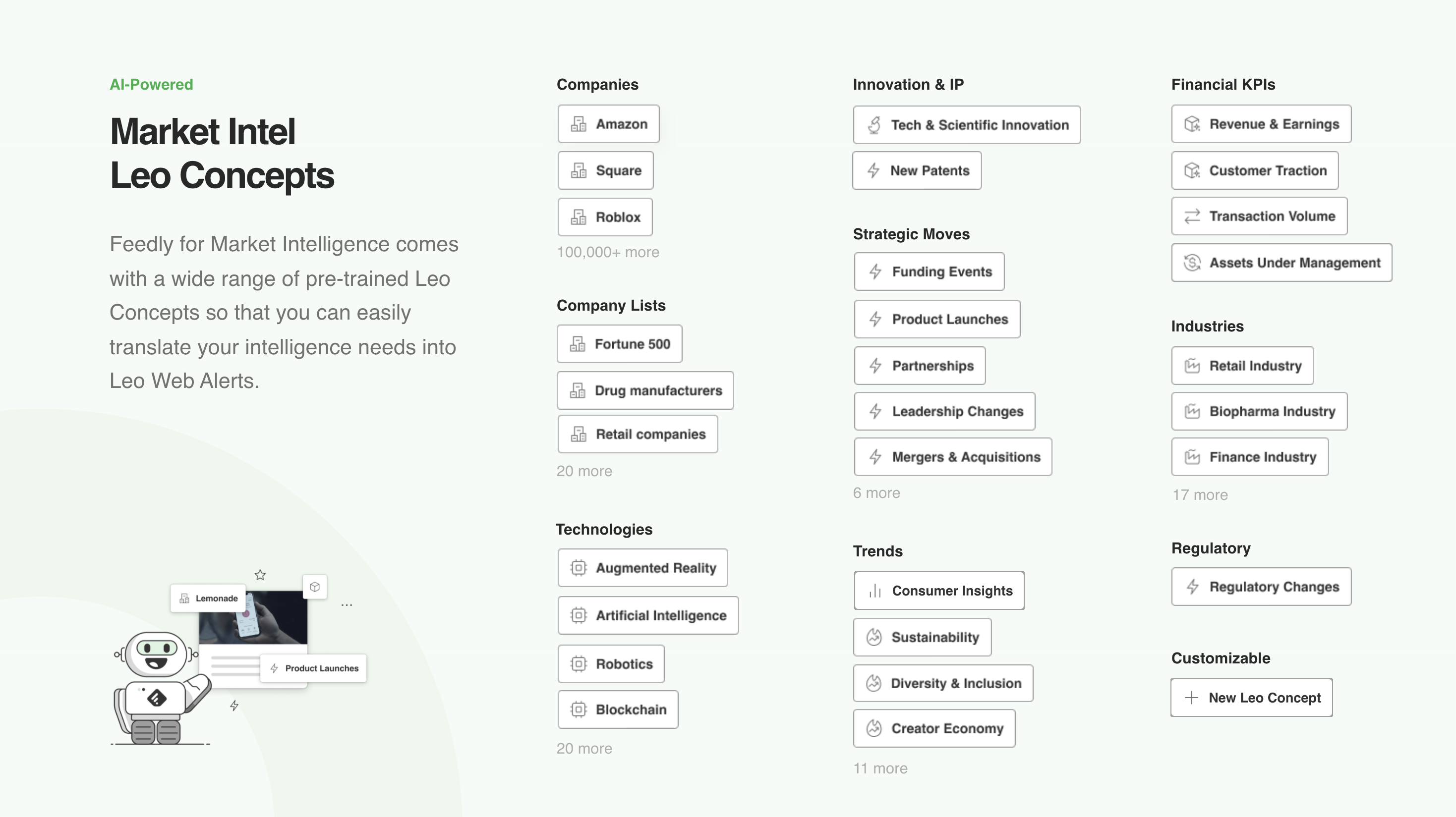 Feedly for Market Intelligence customers can reach out to enterprise@feedly.com to share feedback on existing Leo Concepts or suggestions for new Leo Concepts. We value our community’s input, as this ensures Feedly is working at full capacity to serve your Market Intelligence needs.