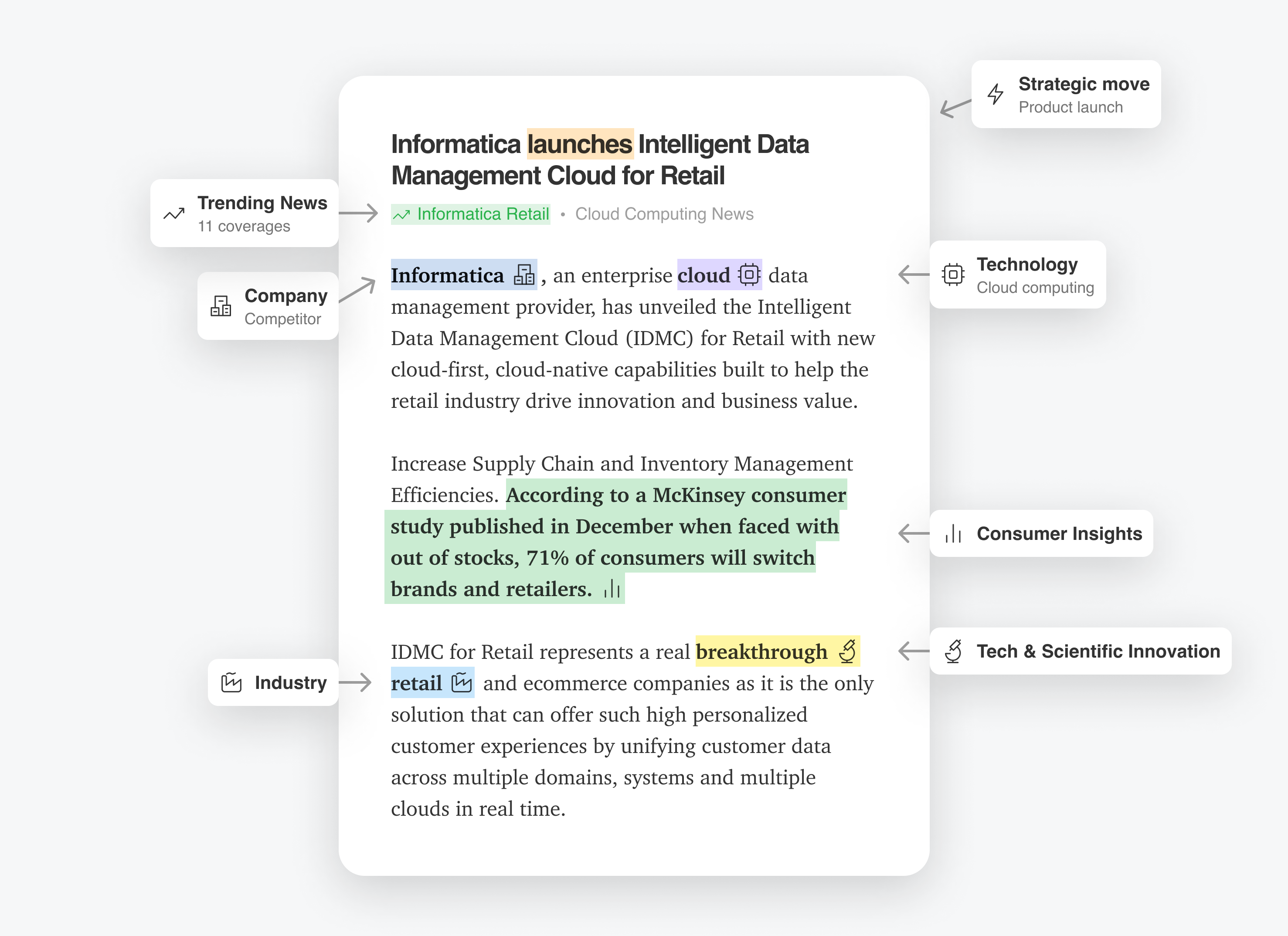 - ‘Product Launches’ is a Strategic Move Leo Concept that intelligently scans for new product announcements. This Concept will be able to find relevant updates even if the term “product launch” isn’t explicitly used.