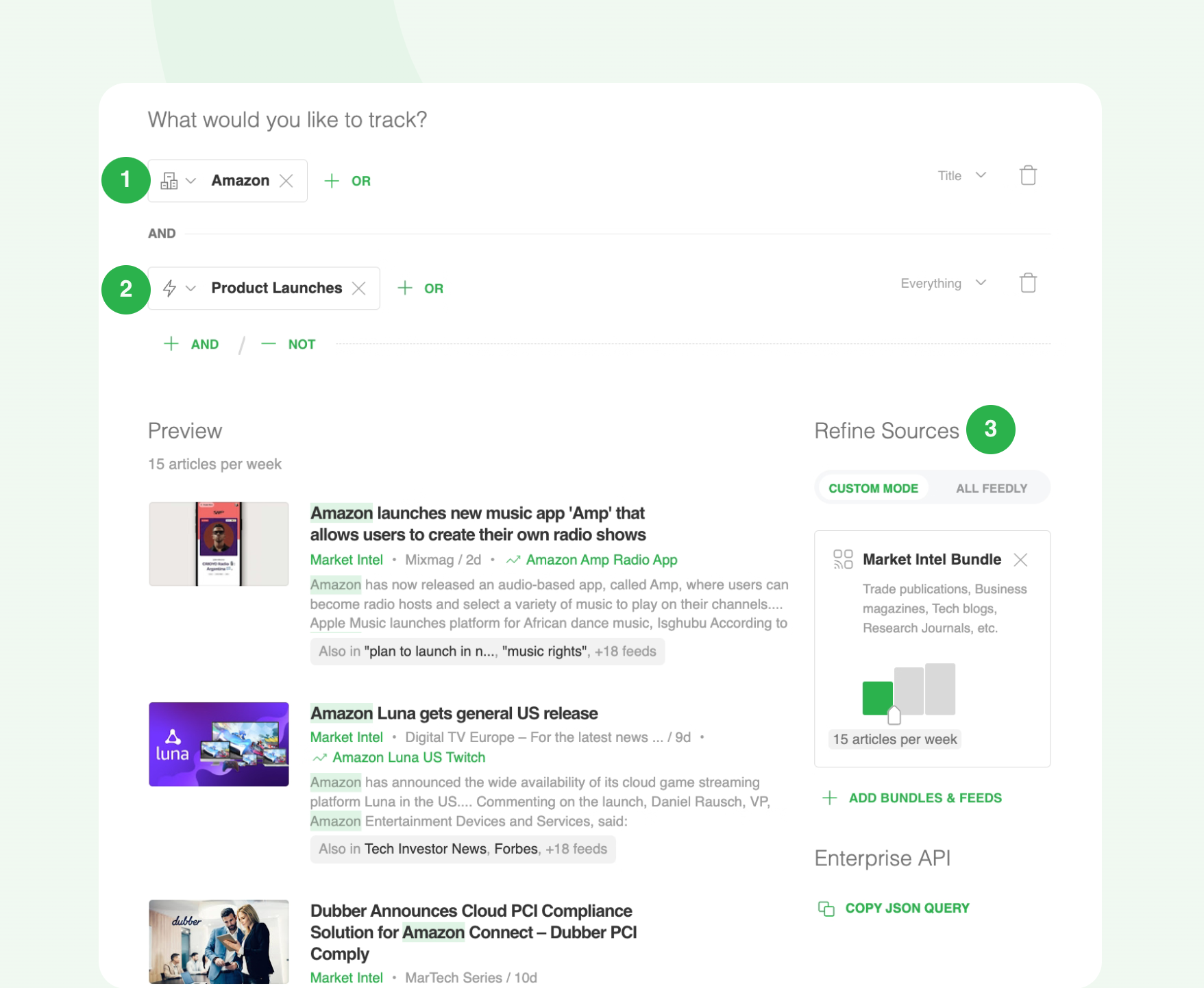 - Use AND, OR, NOT operators to combine multiple Leo Concepts and refine your focus. In our example, we use AND to only track articles that reference both Amazon and product launches.